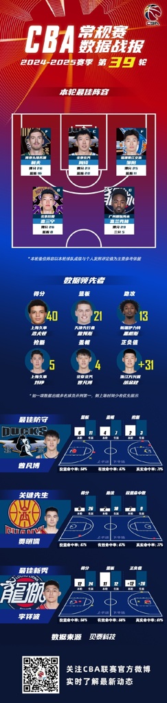2024-2025赛季CBA联赛常规赛第39轮结束较量,来自南京同曦篮球俱乐部的利夫,北京首钢篮球俱乐部的周琦,福建浔兴SBS男篮的邹阳,北京控股篮球俱乐部的廖三宁和龙狮篮球俱乐部的富兰克林入选CBA联赛常规赛第39轮最佳阵容!