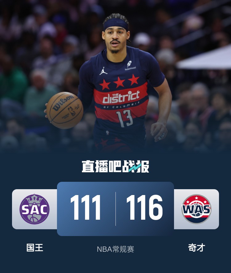 比赛开始,双方上来都比较慢热,小萨博尼斯接连攻击内线砍下9分帮助国王建立主动权,萨尔连续外线发炮回应,首节双方打成26平,次节双方继续胶着拉锯战,比分始终拉不开,奇才全民皆兵一波9-0拉开双位数领先,但拉文联手蒙克半场追到差3分。下半场,奇才外线连续3记三分重新建立领先,小萨博尼斯内线还是连续强打止血,但普尔连续杀伤单节上双守住14分领先,末节双方继续拉锯战,德罗赞里突外投上双带队追分,奇才多点开花始终能回应守住两球以上领先,最终奇才116-111力克国王,终止3连败同时送对手3连败。