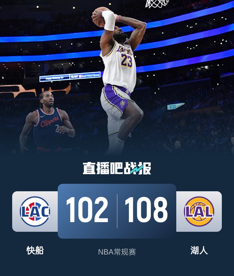 首节开打后东契奇火力全开独得12分,克内克特外线续上火力,湖人早早发力确立两位数优势,哈登联手莱昂纳德及时回应,首节结束时湖人领先6分,次节回来,快船一度追至1分,但进攻突然断电遭遇7分钟得分荒,湖人顺势拉开比分,半场战罢,湖人已经领先13分。易边再战后莱昂纳德突然发力连续取分,但湖人多点开花将分差扩大到20分,末段快船回敬11-3攻击波保留悬念,湖人领先12分进入末节,末节上来,快船稳扎稳打紧咬比分,詹姆斯大帽邓恩,快船连续不中后芬尼-史密斯两罚中一,快船回天乏术,最终湖人108-102再胜对手,反超掘金升至西部第二。