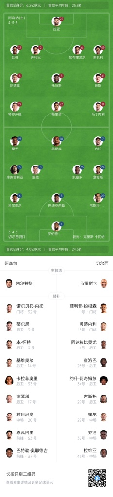 阿森纳替补:32-内托、3-蒂尔尼、4-本-怀特、15-基维奥尔、17-津琴科、20-若日尼奥、33-卡拉菲奥里、37-奥耶德吉、53-恩瓦内里