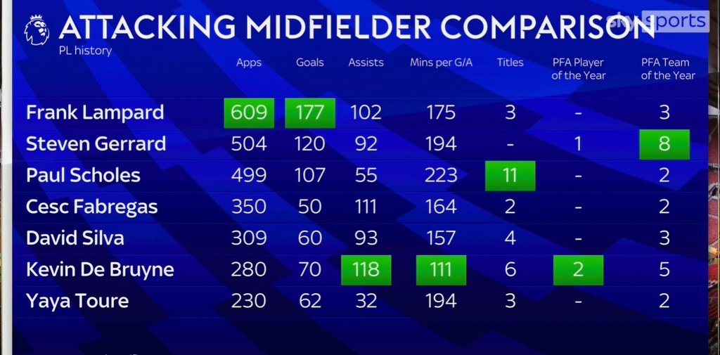 节目中列举了兰帕德、杰拉德、斯科尔斯、法布雷加斯、大卫-席尔瓦、德布劳内和亚亚图雷7位名将的数据,兰帕德的出场数和进球数毫无悬念排名榜首,德布劳内280场比赛送出118次助攻,平均每111分钟就进球/助攻,这两项数据排名榜首。