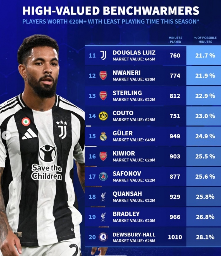 当前位置: 首页 > 足球新闻 > 德转列本赛季冷板凳:D-路易斯&基耶萨领衔,恩德里克&津琴科在列