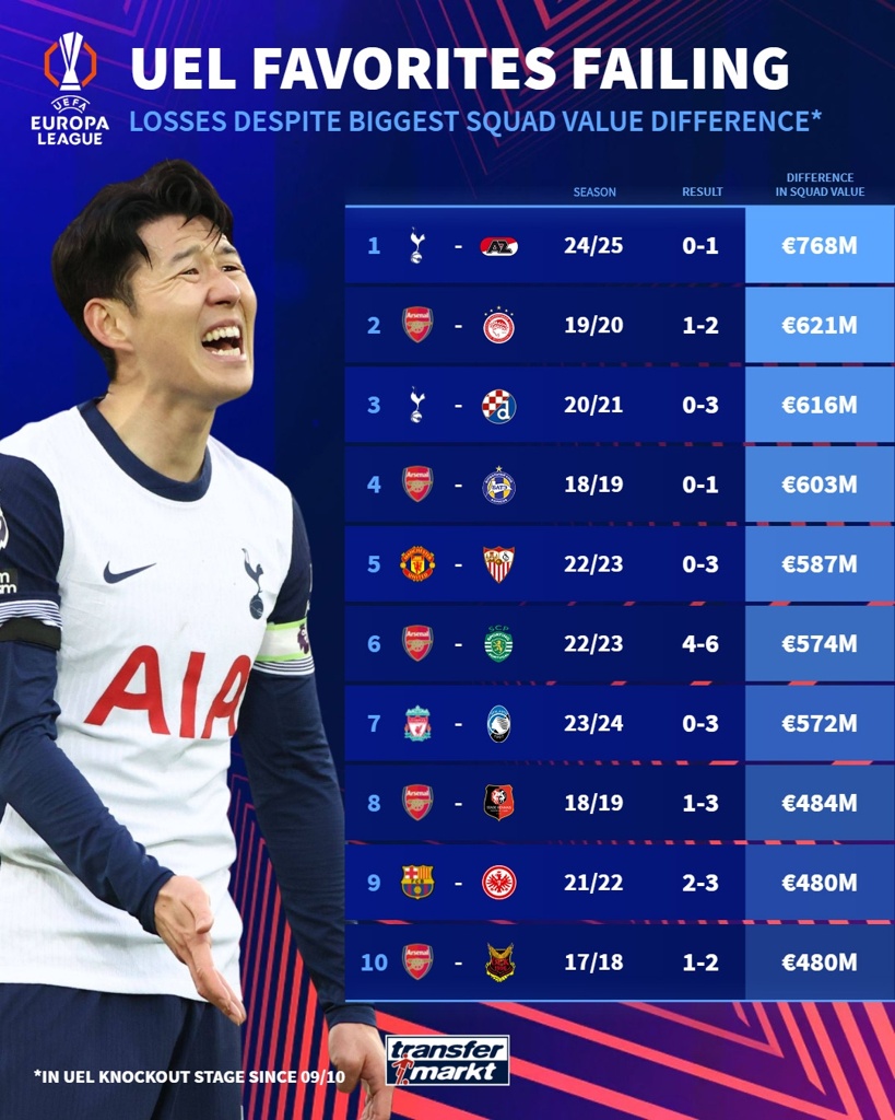 03月08日讯 欧联杯1/8决赛首回合,热刺0-1客负阿尔克马尔。据德转统计,两队阵容身价差达到7.68亿欧,创造了一项尴尬纪录——欧联输球的最...