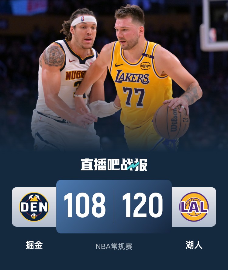 首节之争湖人面对残阵掘金完全掌控比赛,东契奇有如神助8分钟里狂轰20分,期间个人得分比掘金总分还高,湖人在他的带动下首节命中9记三分并以近七成的命中率轰下46分取得17分的领先;次节归来湖人虽然没能像首节继续爆发,但第一节建立起的巨大领先让他们一直掌控比赛,整个上半场替补端4人出场合力13投10中帮助球队带着14分领先进入下半场。休息归来掘金进攻端也开始回落直接导致最终败局,湖人则越战越勇,角色球员纷纷站出来抢分并在第三节就拉开28分的优势;末节双方早早撤下主力,但掘金替补端疯砍反扑一度追回20分,奈何前三节挖坑太大还是没能上演神奇。最终,湖人主场击退掘金完成复仇。