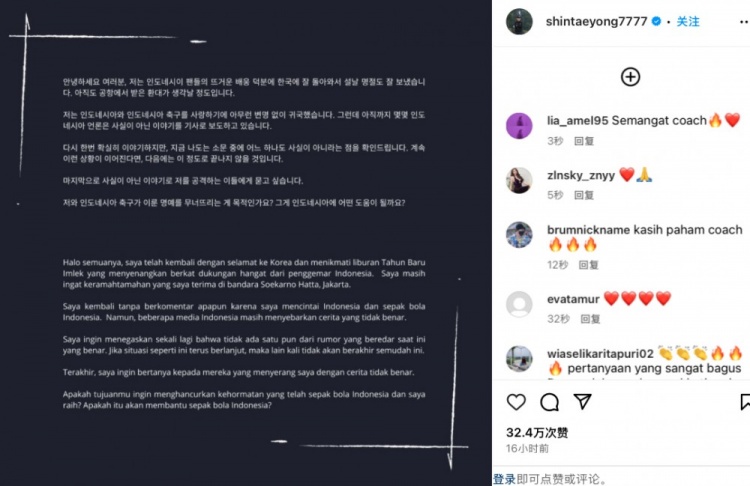 2月2日讯 今日前印尼主帅申台龙更新社媒,用韩语和印度尼西亚语发布声明,对部分印尼媒体进行警告。近期有印尼媒体报道,称申台龙在执教印...